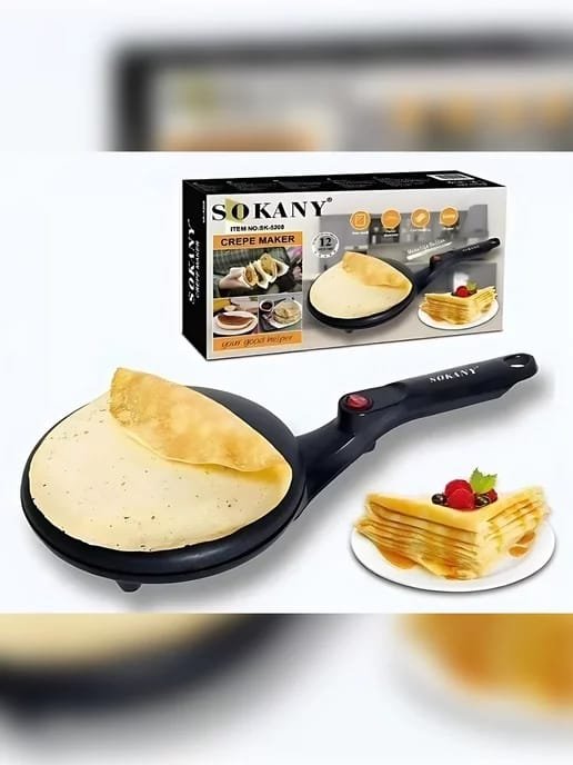ake your breakfast game to the next level with the versatile Sokany SK-5208 Crepe and Pancake Machine. With a powerful 1000W heating element and a spacious non-stick cooking surface, this appliance allows for precise temperature control to achieve the perfect golden-brown finish every time . The cool-touch handle and heat-resistant exterior ensure safe operation, while its lightweight and compact design make it easy to store. Perfect for making crepes, pancakes, and even reheating leftovers, it's a handy tool for quick and delicious meals . -