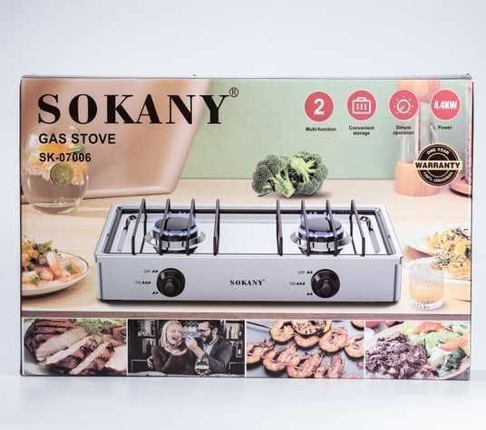 Enjoy efficient and portable cooking with the Sokany SK-07006 2-Plate Gas Stove. Designed for versatility, this compact tabletop gas cooker features two powerful burners with a total output of 4.4KW, allowing you to prepare multiple dishes simultaneously with ease . The durable stainless steel body and enamel cooking surface ensure long-lasting performance, while the convenient electronic ignition system lights the burners instantly without matches . With simple mechanical knob controls and compatibility with bottled gas, this portable stove is perfect for home kitchens, small apartments, picnics, camping trips, or as a reliable backup during power outages . -