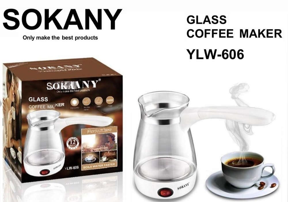 Experience the authentic taste of Turkish coffee with the versatile Sokany YLW-606 Glass Coffee Maker. Powered by 600 watts and featuring a 500ml borosilicate glass jug, this electric coffee pot is designed for more than just coffee—it's perfect for heating milk, melting butter, warming honey, and even brewing tea . The one-button operation at the base makes it incredibly easy to use, while the graduation markings help you measure the perfect quantity every time . With its sleek glass design and sturdy handle, the Sokany YLW-606 is a stylish and practical addition to any home or office kitchen . -