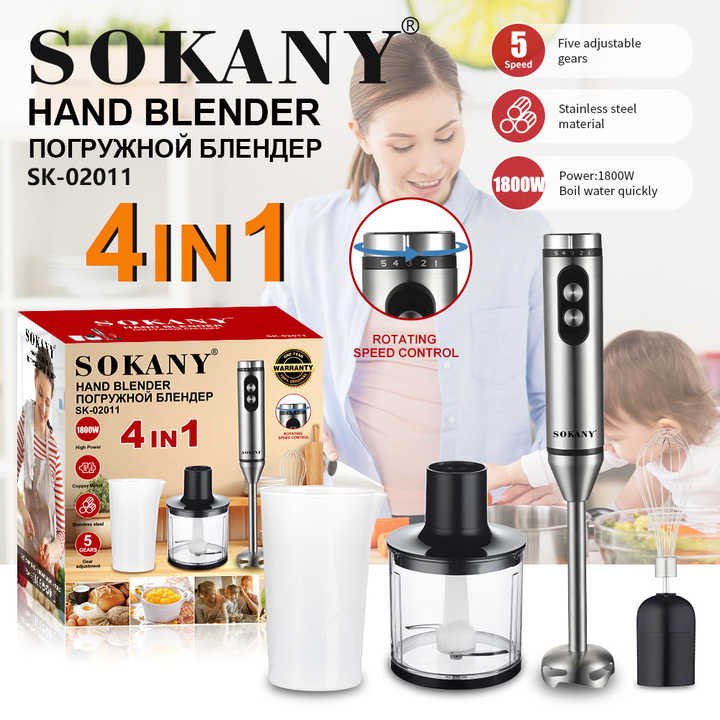 Transform your kitchen experience with the versatile Sokany SK-02011 4-in-1 Hand Blender. This complete food preparation system combines a powerful motor (available in 500W-800W) with five essential kitchen tools in one space-saving design . The stainless steel blending arm tackles soups and smoothies directly in the pot, while the included chopper bowl effortlessly handles herbs, nuts, and vegetables . The whisk attachment whips cream and egg whites to perfection, and the measuring beaker doubles as a mixing container for precise results -